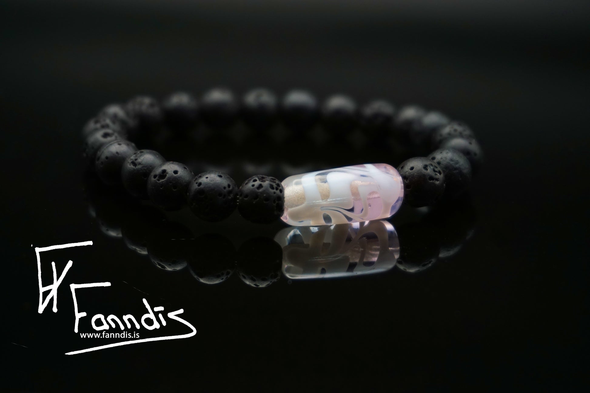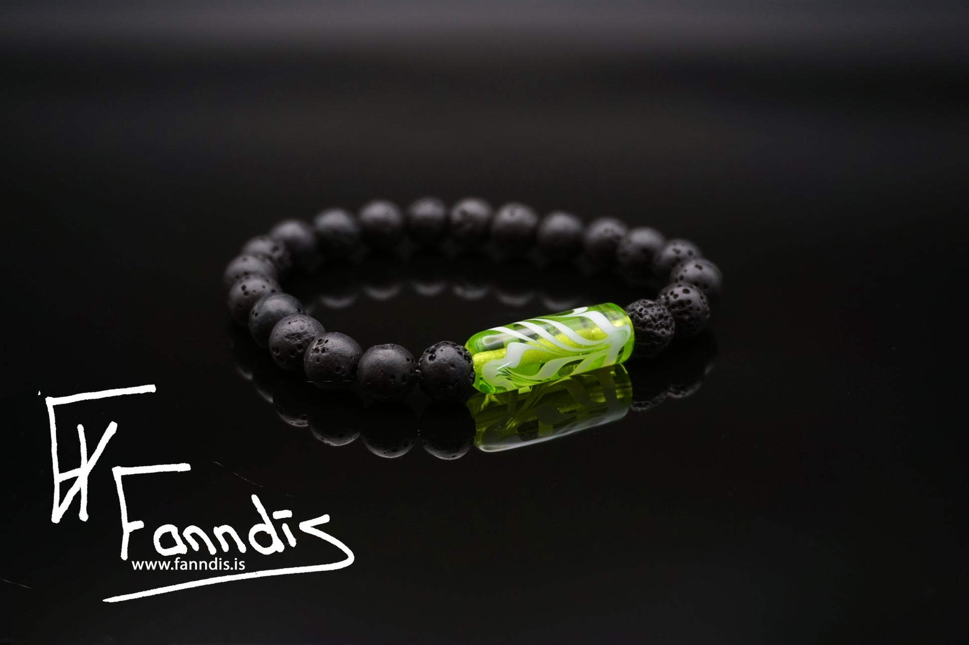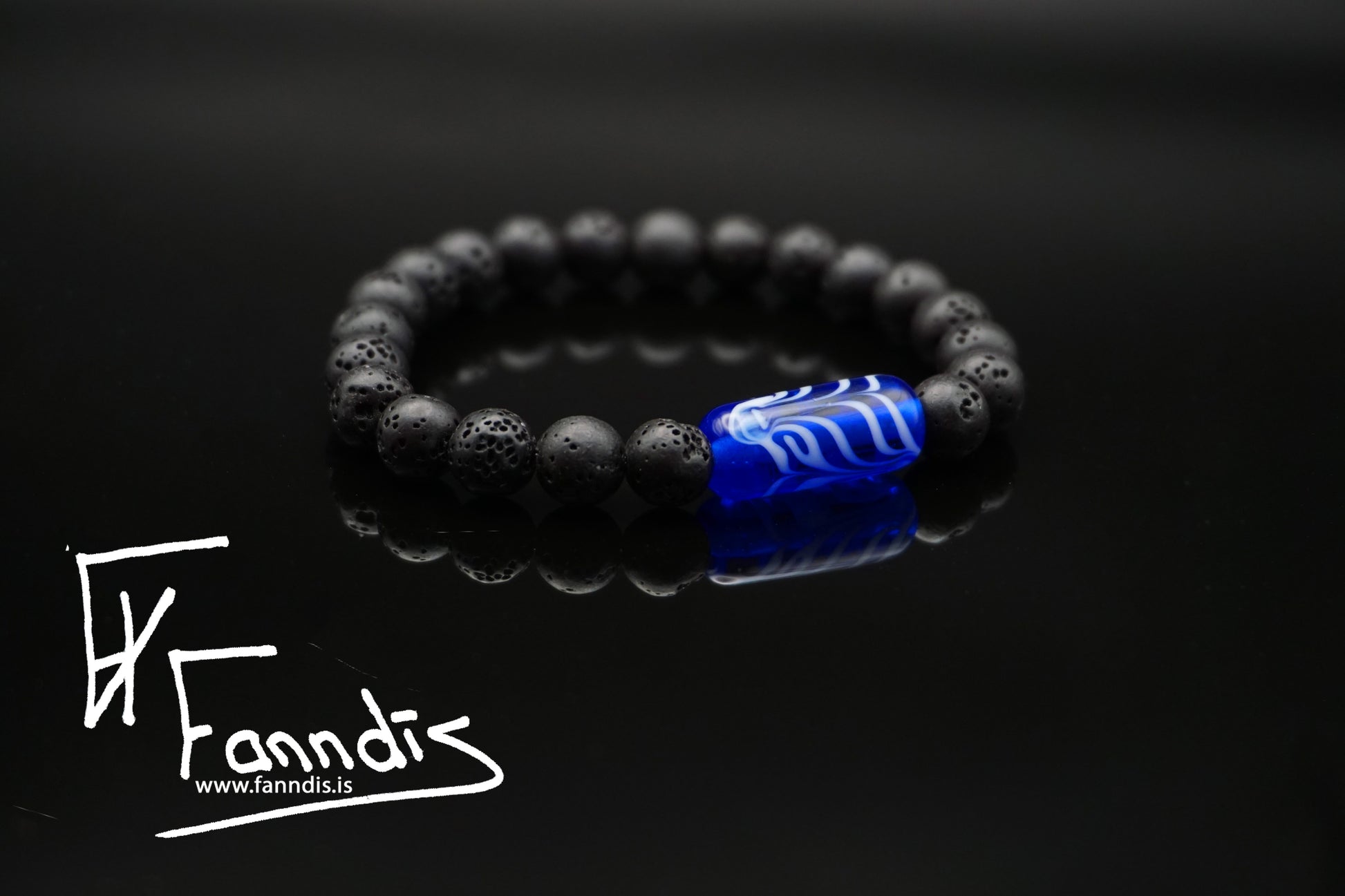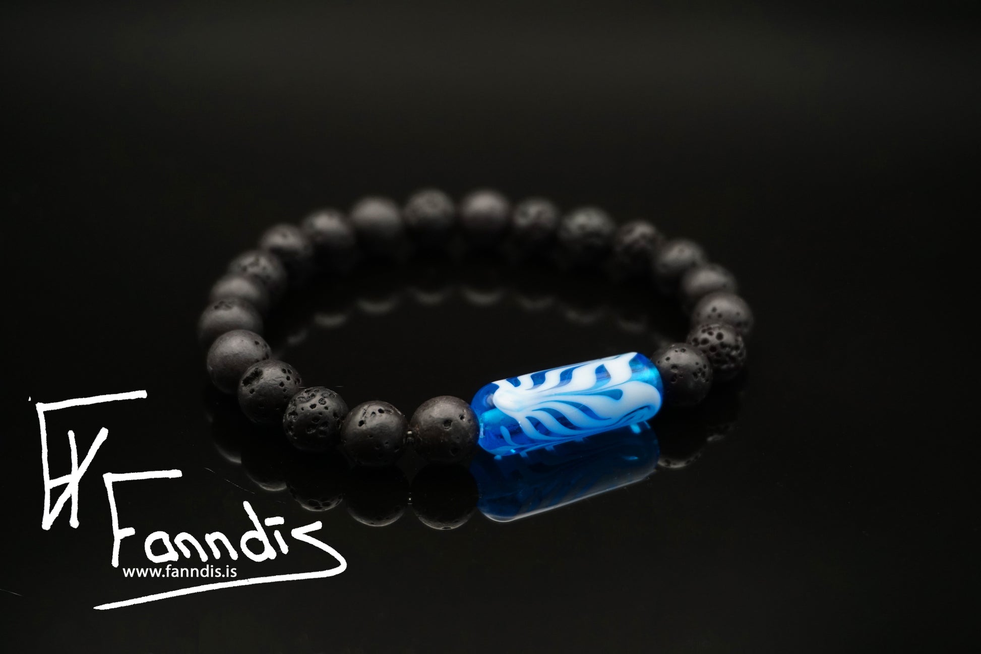 Armböndin hafa víkinga glerperlu með fjöðrunar munstri í bland við hraunperlur og teygju. Fanndís handgerir allar glerperlurnar af alúð yfir opnum eldi. Fánlegt í stærð 16 cm, 17 cm, 18 cm, 19 cm og 20 cm Þar sem tölvur geta sýnt liti með mismunandi hætti getur raun litur glersins verið ögn öðruvísi en myndirnar sýna.